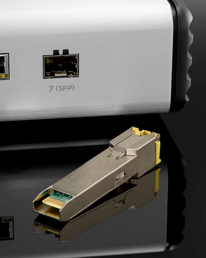 端口 7 是一個固定 1000Mbps (1G) SFP 端口,兼容外部 1000Base-T (IEEE 802.3ab) 和 1000BASE-LX/SX [802.3z-1998 (CL38)] SFP 收發器/模組,並支援單模和多模光纖。