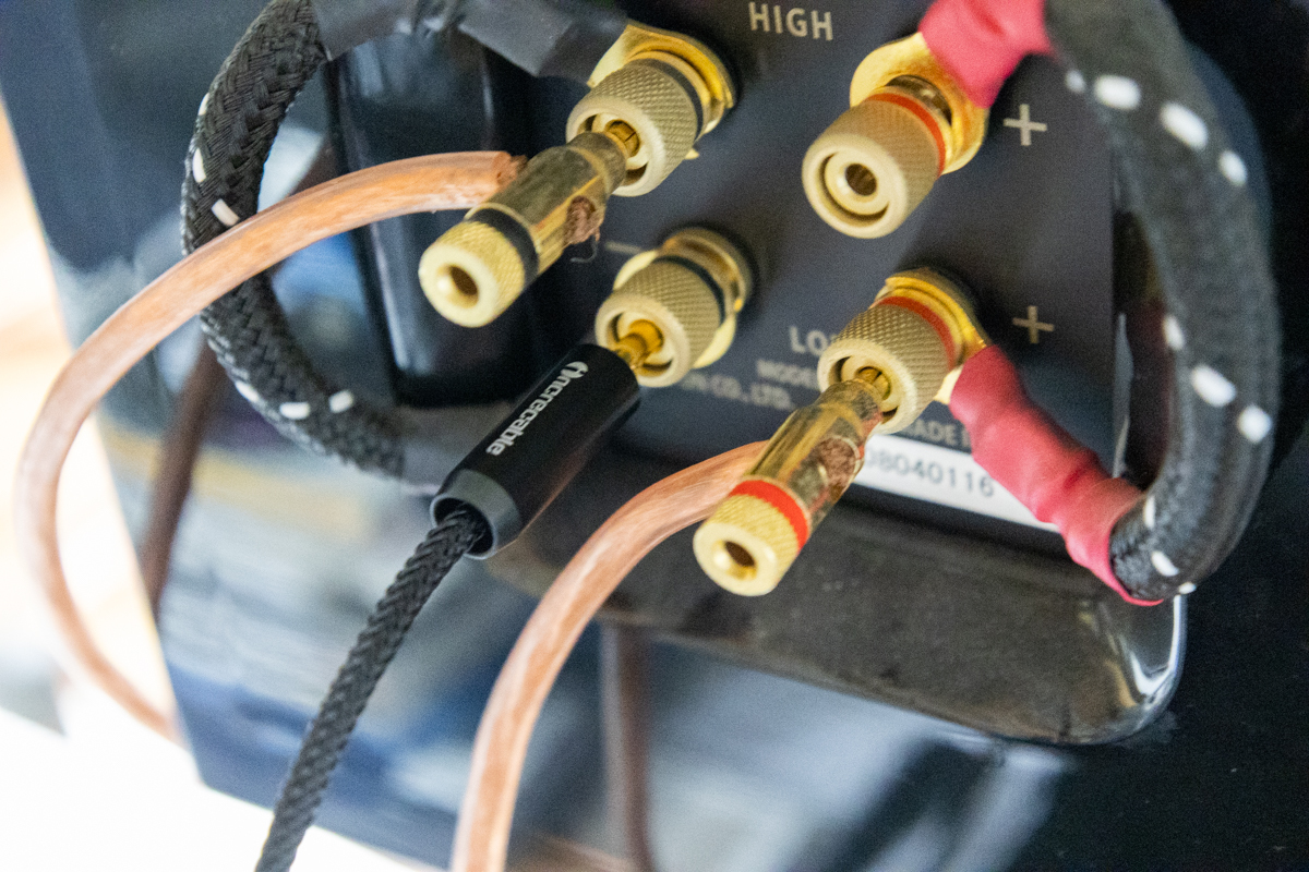 如果是這樣的話,我家的JBL「K2 S9500」也會有甚麼不錯的效果吧。雖然這樣說 K2 有兩顆 38cm 的低音,而且低音、中高音域的壓縮驅動單體有各自的端子、因此從後級出來是 Triple wire 的喇叭線,這樣 iEARTH 要插在哪裡比較好呢?