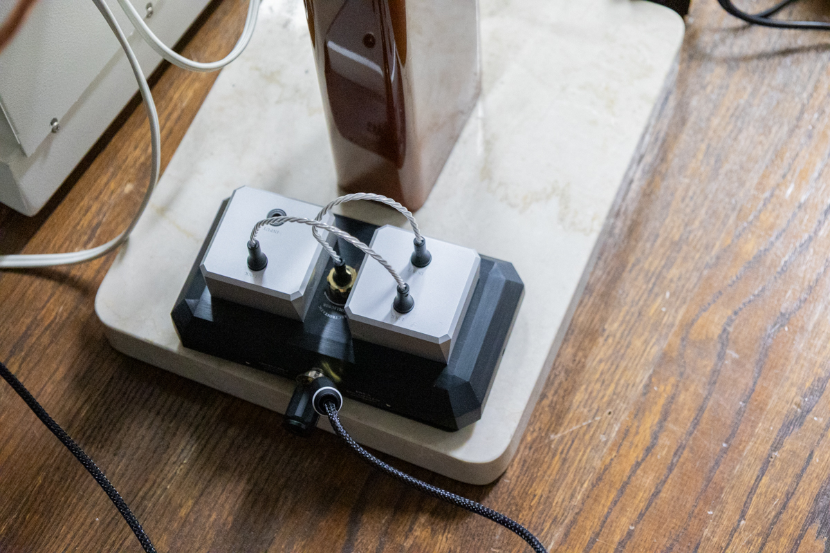 「Silver iEARTH」是用來減輕喇叭驅動單體和分音器上的高電流造訊。附屬的線則是採用Y插到香蕉插,哪個插座都可以插在喇叭上(譯者:依照原廠線材設計方向,由Y插到香蕉插的效果會比較好)。雙聲道的話則必須使用兩顆。