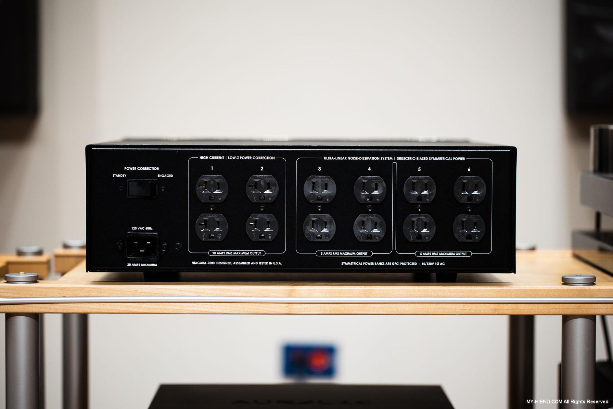 Niagara 7000在擺放上不需要特地遠離音響系統,本身隔離效果很好且沒有明顯噪聲,只有在將耳朵非常靠近器材時會有細微的正常電流聲,將其放在音響架上毫無問題。連接器材電源插頭時的緊密性非常高,電源端子座會很密合地夾住電源線端子,使用手冊特別要用家慢慢地拔插電源端子避免損壞,按照原廠建議連接好所有器材的電源線後開啟總開關再開啟音響器材即可,在開啟擴大機的同時也會聽到Niagara 7000也會有一個啟動聲。