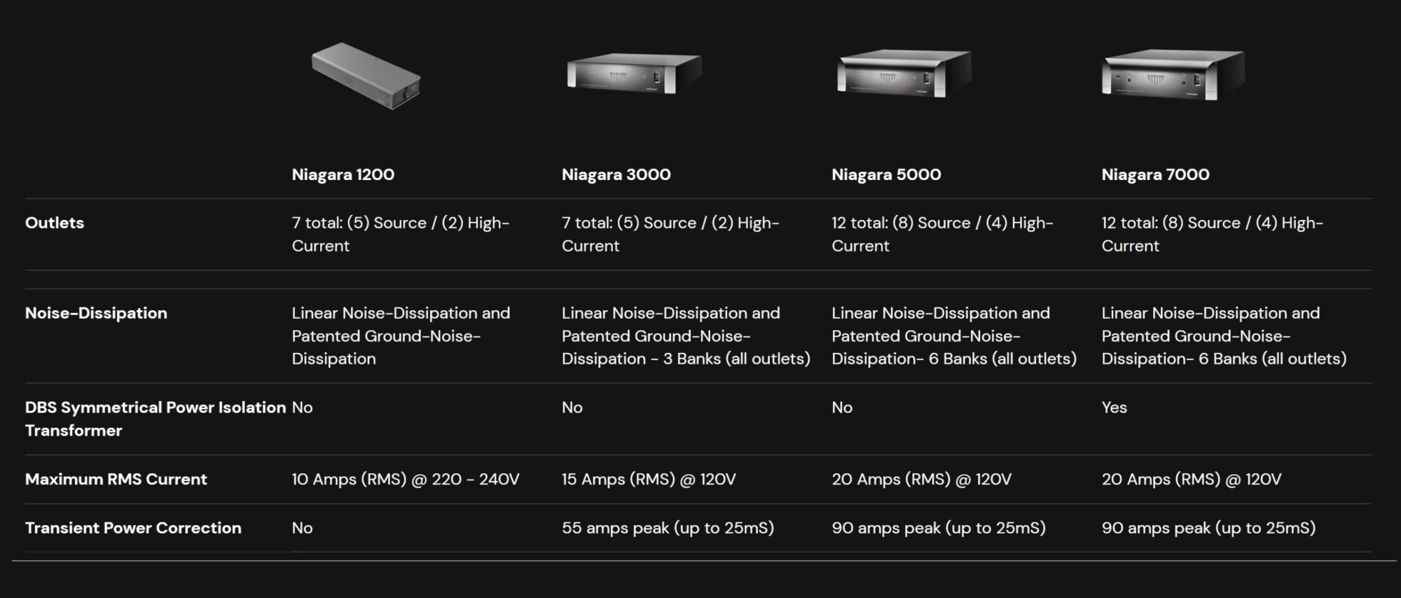 電源處理器是在各個電子器材領域中都十分常見的,尤其是在音響與影像系統中,電力除了用來運作器材以外,聲音訊號來源便是由最初的電力乘載,因此電力的狀態會直接影響最終的結果,很多音響發燒友都會透過電源處理器來保持電力的完整與純淨,常見於穩定電壓、濾除雜訊干擾、重塑完美波型、保護器材等功能,電源對於音響系統的聲音表現影響至關重大,AudioQuest在電源處理器上便是相當出名,不同功能型號便多達10款,小至電源排插大至重裝電源處理器皆能滿足不同需求的音響系統。Niagara系列更是當中的領頭系列,根據輸出能力不同有著Niagara 1200、Niagara 3000、Niagara 5000與Niagara 7000總計4個型號。