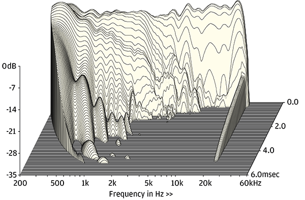 DSP 也允許對前軸和離軸響應進行一定程度的控制,但圖 1 顯示 Focal 對此的處理手法十分克制,並未刻意消除中音單元和鈹球頂高音單元在 3-6kHz 分頻點附近的細微波動。在 500Hz-2kHz 範圍內也存在其他單元/側面板模式(請參閱 CSD 瀑布圖,圖 2)。除此之外,響應曲線略呈凹陷趨勢,但誤差僅 ±2.4dB,且單元對匹配度極佳,僅 0.3dB(所有頻率範圍均為 200Hz-20kHz)。可選的中音格柵幾乎沒有負面影響(藍色曲線),而略微內傾(灰色曲線)後,揚聲器的頻率響應可以說更加均勻。此處顯示的約 22kHz 的頻率響應極限是 Naim 數位濾波器的結果,主聲道(左聲道)和從聲道(右聲道)的延遲均為 10.5 毫秒。